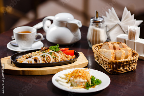pilaf, salad, wooden, anise, arabian, arabic, asian, bow, chili, delicious, dinner, dish, eastern, food, fried, garlic, garnet, epicure, hot, lunch, meat, napkin, national, nourishment, old, pepper, plate, red, rice, spice, spicey, star, table, tomatoes, traditional, uzbek, vegetable, egg, tea, bread
