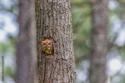 eastern, screech, owl, nest, hole, trunk, green, birch, plant, pine, outdoors, tree, wood, red, summer, texture, animal, spring, landscape, bird