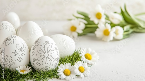 egg, easter, decoration, daisy, springtime, floral, ornamental, decorative, flower, still life, arrangement, flora, cheerful, greeting, white, daisy, blossom, bloom, gift, flower petals, season, celebration, painted, holiday, grass