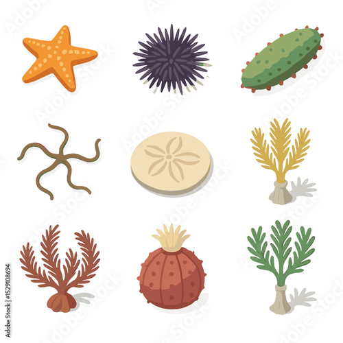 Echinoderm Icon Set. Isometric Flat icon set of echinoderms: sea star, sea urchin, sea cucumber, brittle star, sand dollar,