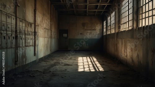 Echoes of Industry: Sunlight streams through grime-coated windows, illuminating the dust-laden floor of an abandoned factory, a haunting testament to bygone labor.