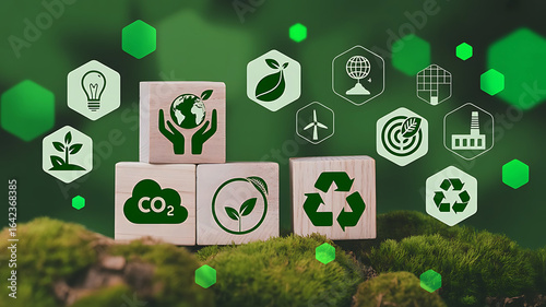Eco friendly environmental protection concept with green icons and natural background symbolizing sustainability and renewable energy