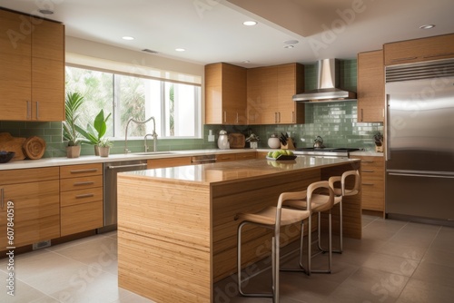 eco-friendly kitchen with bamboo cabinets, energy-efficient appliances, and eco-friendly cookware, created with generative ai