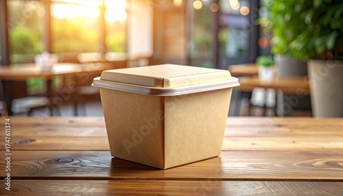 Eco-friendly kraft paper take-out container with a secure lid, prominently displayed on a warm wooden table in a sun-drenched cafe, ideal for sustainable food packaging and convenient meal delivery