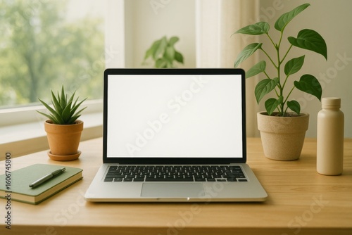 Eco-friendly minimalist workspace with laptop on wooden desk, surrounded by indoor plants and natural sunlight. Concept of sustainability, technology, remote work, productivity, and conscious living.