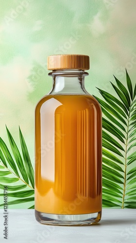 Eco-friendly packaging seasonal of A stylish glass bottle filled with golden liquid, showcased against a backdrop of green palm leaves, evoking freshness and wellness.