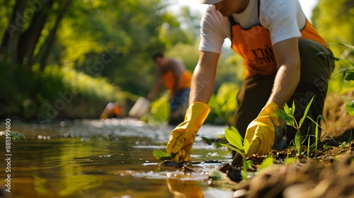 Eco-Friendly Volunteers Cleaning Riverbank for Water Cleanup Project, Community Environmental Effort