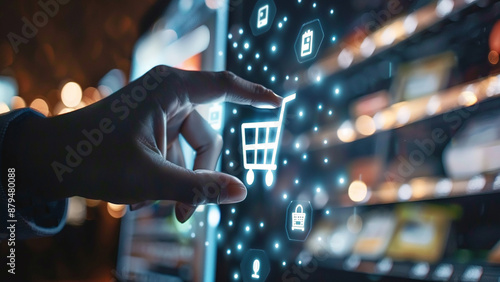 E-commerce and online shopping concept with icons, website ad, email, social network, SEO, video, mobile app,Digital online marketing commerce sale concept, virtual screen,ecommerce growth concept,