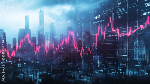 Economic crisis concept shown by declining graphs and digital indicators overlap modernistic city background. Double exposure.