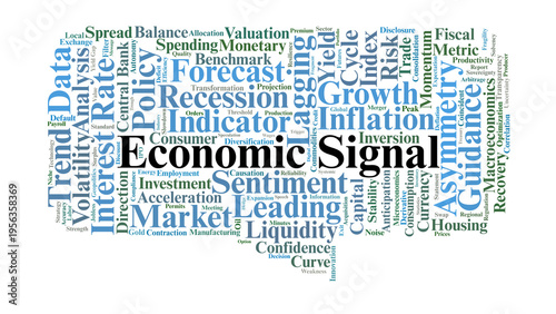 Economic Signal Word Cloud. A Professional Visual Guide to Market Indicators, Information Asymmetry, Policy Signaling, and Macroeconomic Trends Used to Predict Economic Shifts.