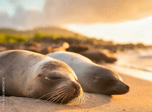 Ecuador. The Galapagos Islands. Seals are sleeping on the beach. Beaches of the Galapagos.