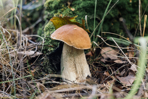 Edible mushroom penny bun in the forest, macro. Beautiful mushroom boletus edulis, ceps, porcini on green grass background close up.