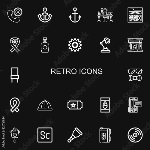 retro, icon, set, vector, phone, anchor, candle, making, frame, ribbon, brandy, explosion, desk, lamp, fireplace, chair, sunglasses, winter, hat, ticket, smartphone, cuckoo, clock, scout, wooden, leg, walkman, vinyl, illustration, design, symbol, isolated, signs, element, black, vintage, old, graphic, flat, background, white, style, web