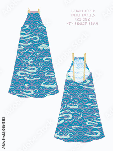 EDITABLE VECTOR DRESS MOCKUP. TEMPLATE FOR SHOWCASING FABRIC PATTERN DESIGN. TECHNICAL ILLUSTRATION OF HALTER NECK BACKLESS MAXI DRESS WITH WAVES PATTERN IN SHADES OF BLUE, YELLOW AND PURPLE.