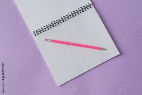 Education concept - pink pencil close up and opened notebook for educational new academic year begin or study.Back to school. Copy space
