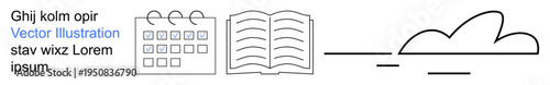 Education, productivity, scheduling, organization, creativity, abstract concepts. Minimalist black and white illustration with a calendar, open book and cloud. Education and productivity