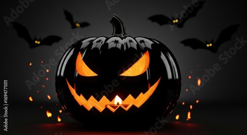 Eerie Black Halloween Pumpkin with Glowing Eyes and Bats in Dark Background