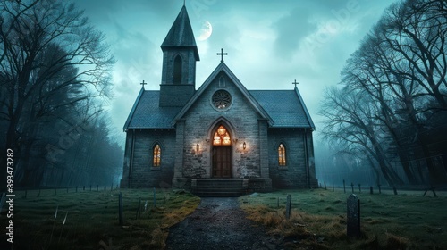 Eerie chapel surrounded by fog and gravestones, evoking mystery at night