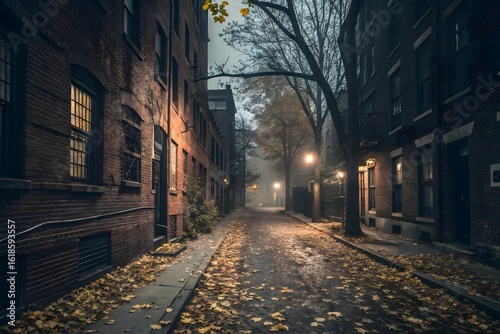 alley, cobbled, street, urban, city, old, historic, brick, building, architecture, autumn, fall, leaf, foliage, weather, fog, mist, haze, evening, night, dark, moody, atmospheric, eerie, haunting, mysterious, lighting, light, street light, lantern, warm, glow, path, paseo, narrow, passage, quiet, empty, lonely, vintage, nostalgic, european, new york city, village, neighbourhood, scene, texture, season