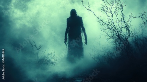 Eerie Ghostly Figure in Misty Forest at Night with Spooky Trees Reaching Up to Cloudy Sky