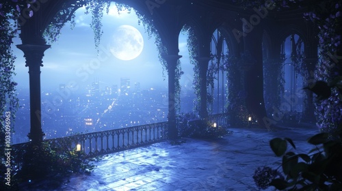 Eerie Gothic Balcony at Night with Moonlit Cityscape - 3D Render Illustration with Cinematic Light and Intricate Details
