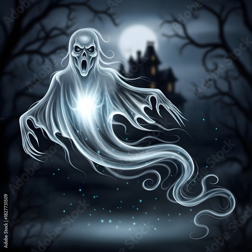 Eerie spectral apparition with glowing chest haunts a dark moonlit haunted mansion forest