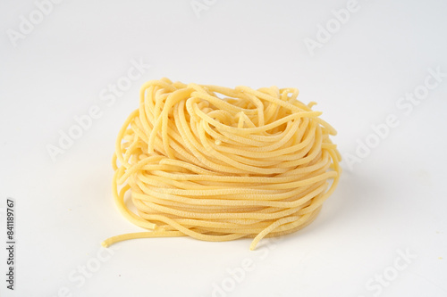 Egg Pasta spaghetti not cooked on a white background rolled into