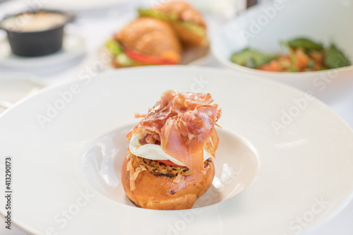 Eggs Benedict on toasted muffins with ham and sauce. Breakfast Buffet Concept, Breakfast Time. Various brunch on the table