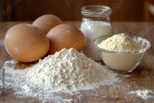 Eggs, flour and milk, on a wooden surface. Perfect for showcasing baking ingredients and recipes.