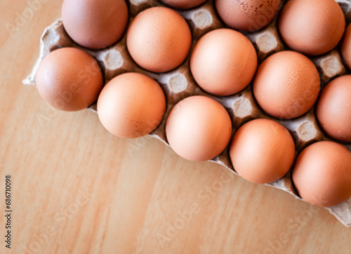 Eggs in a gray container, holding afresh organic egg