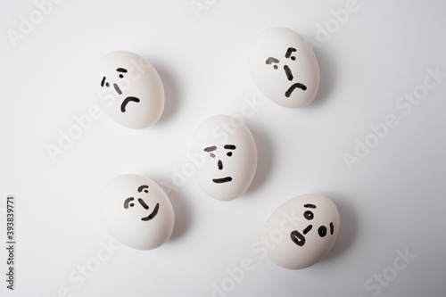 Eggs on a white background, with different emotions on their faces