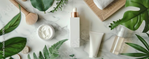 Ego-friendly cosmetics packaging mockup. Natural cosmetics for skin care. Blank craft label. Eco care product. Light background with leaves