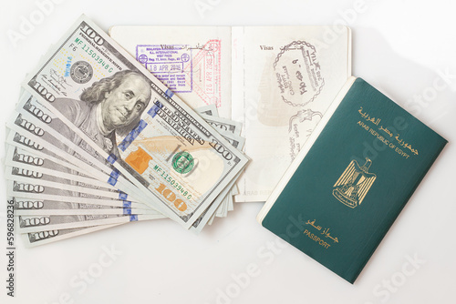 Egyptian Passport, Isolated on White Background, Arabic Text "Arab Republic of Egypt Passport" with one hundred US banknotes
