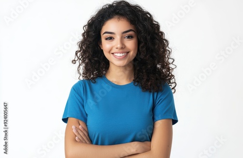 Egyptian woman with curly hair, wearing blue t-shirt and white jeans