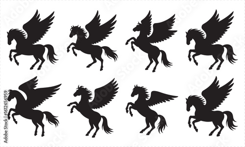 Eight Black Silhouette Pegasus Winged Horse Poses Vector Art white background