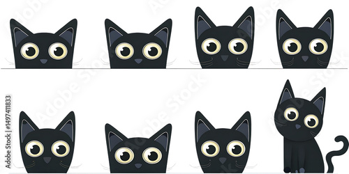 Eight cute black cats peeking isolated on a white background