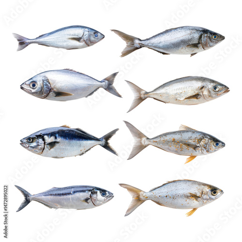 Eight different fish species are arranged in two rows, showcasing variations in size, shape, and color.