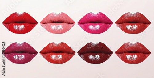 Eight glossy lips in two rows showing vibrant lipstick shades from nude and pink to red and plum, evoking playful glamour and sensual beauty