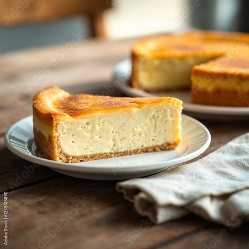Ein cremiges Stück Käsekuchen auf einem weißen Teller mit Serviette auf Holztisch