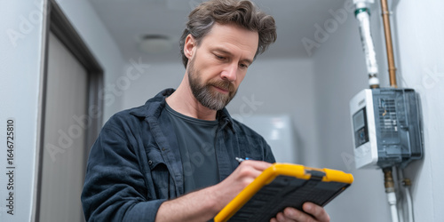 man, workwear, basement, gas, technician, servicing, installer, inspection, electric meter, craftsman, electrician, plumber, structural engineering, checklist, control, reading, heating, stream, energy efficiency