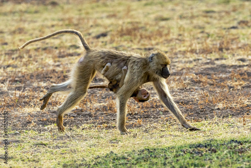baboon, female, sideview, baby, monkey, race, transport, hanging, hold, primate, run, national park, np, zambia, africa, wildlife, closeup