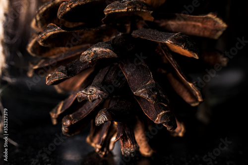 Ein Tannenbaum zapfen auf einem schwarzen Hintergrund, der mit einem Makroobjektiv Fotografiert wurde.