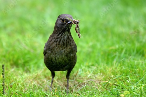 Eine Amsel Weibchen (Turdus merula) mit Würmern für ihre Jungvögel.