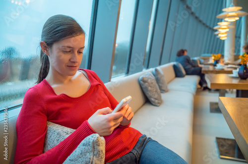 smartphone, woman, girl, student, happy, mobile phone, message, positive, luck, appointment, coffee, eatery, waiting, sitting, winter, pleasant, curious