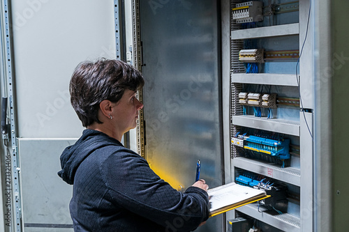 woman, craft, closet, fuse, write down, check, connect, stream, energy, computer, technology, industry, maintenance, work, professional, trainee, trainee, trainee, girl, working man, worker bee, industry, hall, mechanic, adult