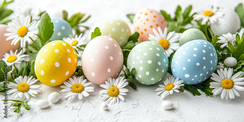 Eine helle, frische Frühlingsszene mit bunten Ostereiern, umgeben von weichen weißen Gänseblümchen und grünen Blättern auf einen weißen Hintergrund Osterkarte Ostern Frohe Ostern