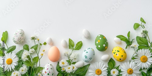 Eine helle, frische Frühlingsszene mit bunten Ostereiern, umgeben von weichen weißen Gänseblümchen und grünen Blättern auf einen weißen Hintergrund Osterkarte Ostern Frohe Ostern