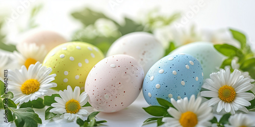 Eine helle, frische Frühlingsszene mit bunten Ostereiern, umgeben von weichen weißen Gänseblümchen und grünen Blättern auf einen weißen Hintergrund Osterkarte Ostern Frohe Ostern
