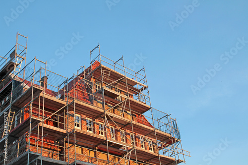 eingerüstetes Backsteinhaus