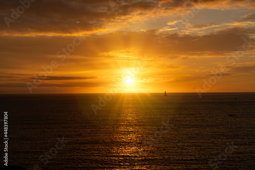 einzigartiger Sonnenuntergang über dem atlantischen Ozean vor der Küste von Porspoder mit dem Leuchtturm der vier (Phare du Four), Bretagne, Frankreich